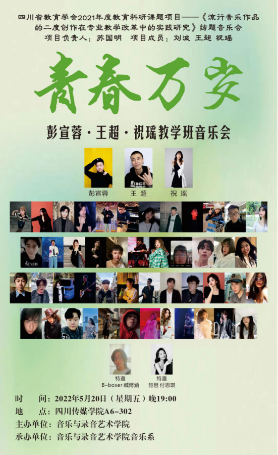 2022年5月20日,本学期第二场教学班音乐会在A6-302成功举办,本场音乐会既是流行教研室举办的一次教学班音乐会,也是四川省教育学会2021年度教育科研课题项目——《流行音乐作品的二度创作在专业教学改革中的实践研究》结题音乐会。