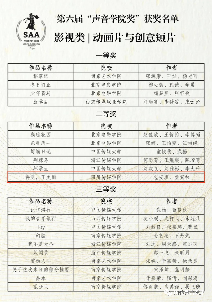 2021年1月24日,第六届“声音学院奖”作品评审工作在北京落下帷幕。本届声音学院奖共收到来自中国传媒大学、北京电影学院、中国音乐学院、南京艺术学院、四川传媒学院等全国24所高校选送的152部参赛作品。