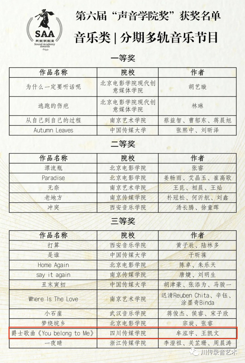 恭喜各位获奖的同学、老师,也期待录音艺术系师生继续深入创作实践,勇于创新,争取更好的成绩!
