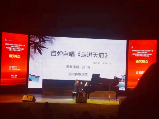 综艺学院音乐系张滨老师获得教法组专业展示(钢琴即兴伴奏弹唱)一等奖,并在颁奖晚会代表四川传媒学院现场做了“即兴伴奏弹唱”展示。