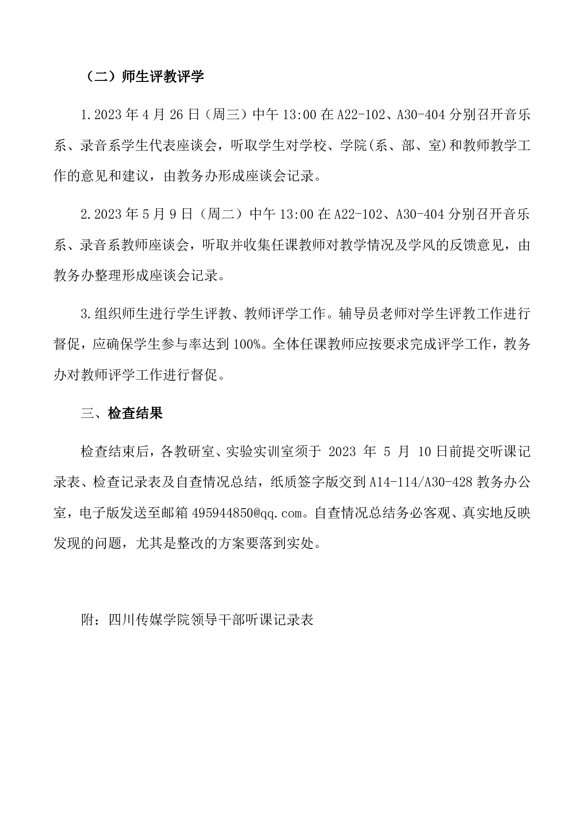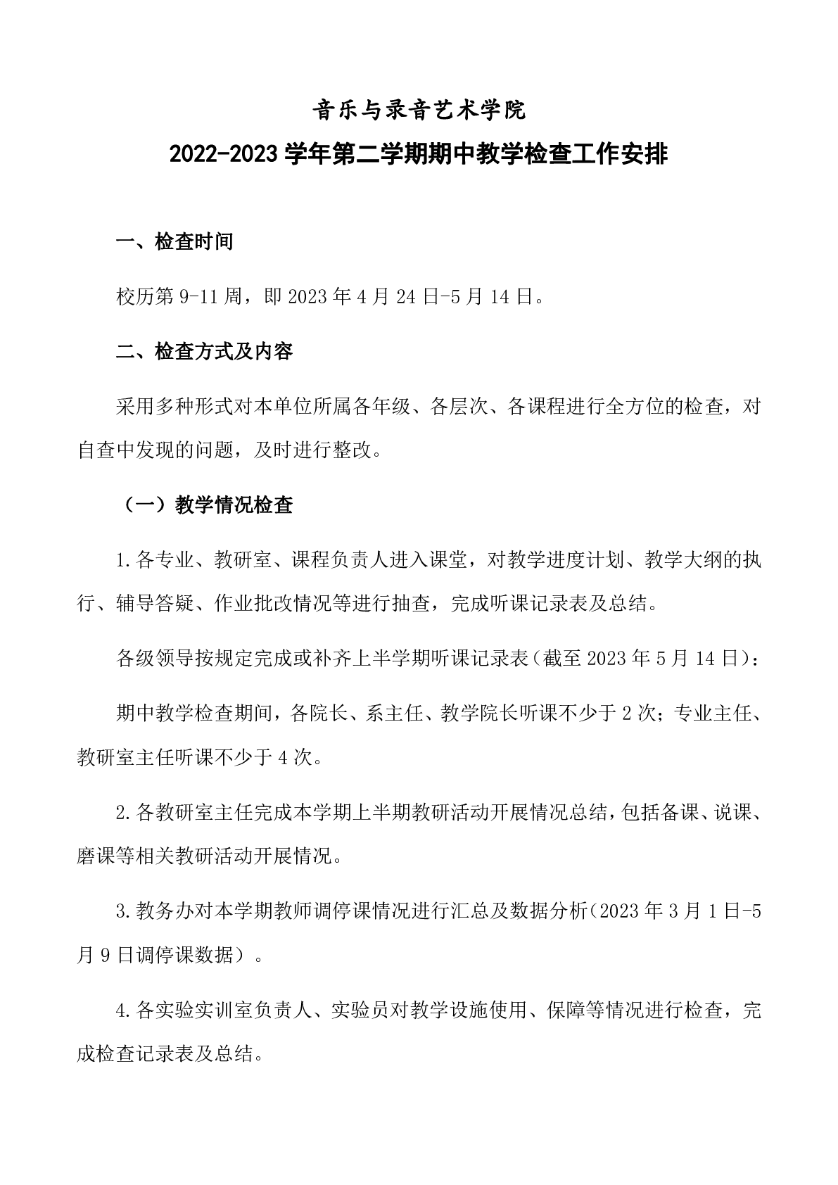 关于2022-2023学年第二学期音乐与录音艺术学院期中教学检查工作安排的通知