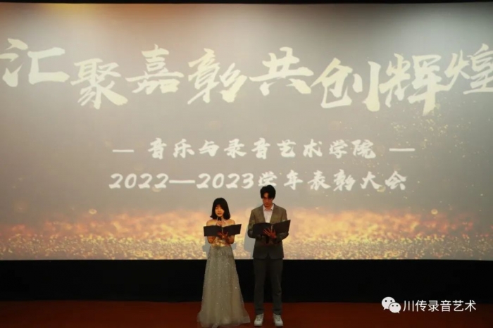2023年12月27日中午12:30,音乐与录音艺术学院在东区小不点110展映厅召开“汇聚嘉彰,共创辉煌”音乐与录音艺术学院2022-2023学年表彰大会。