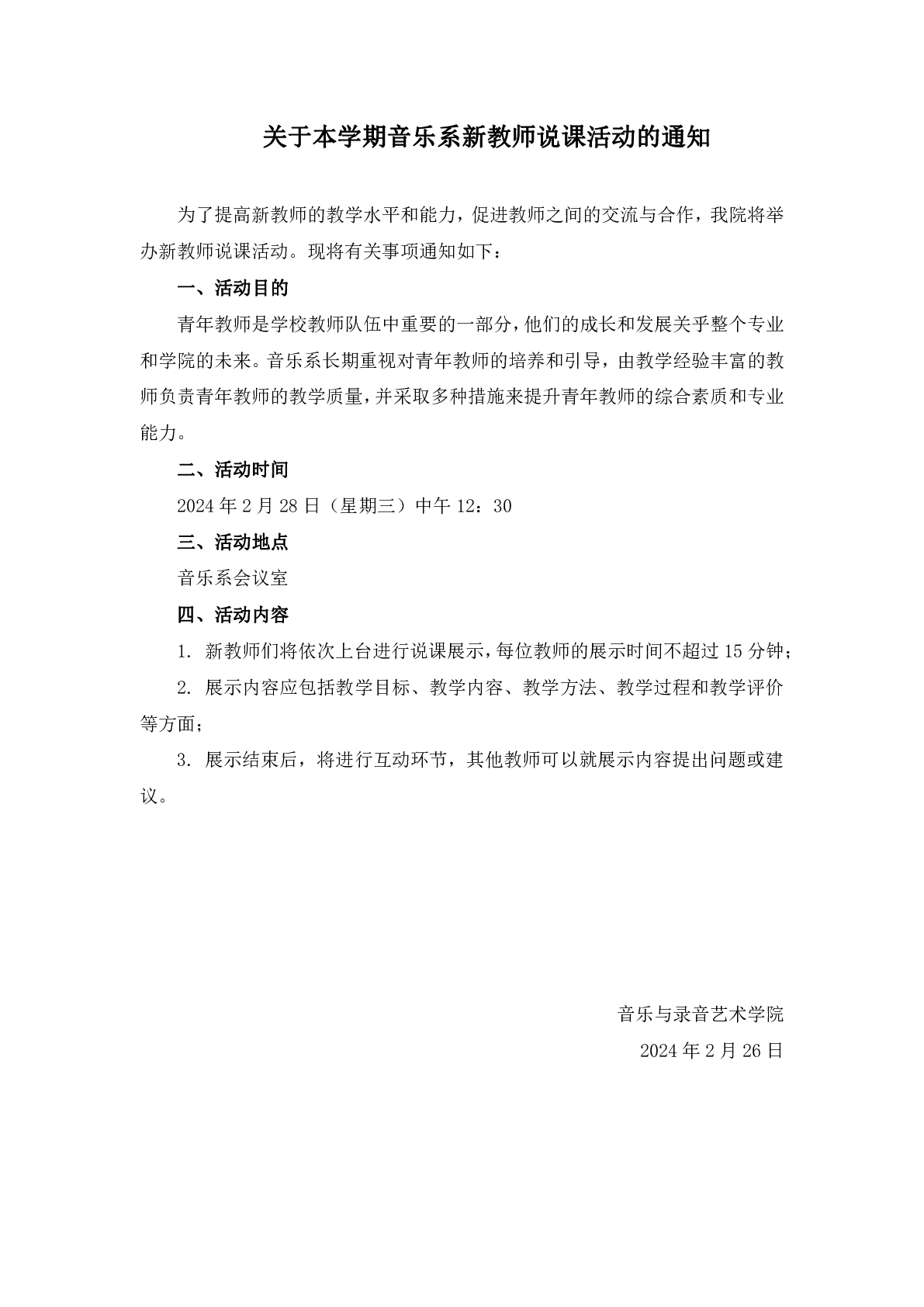 关于本学期音乐系新教师说课活动的通知