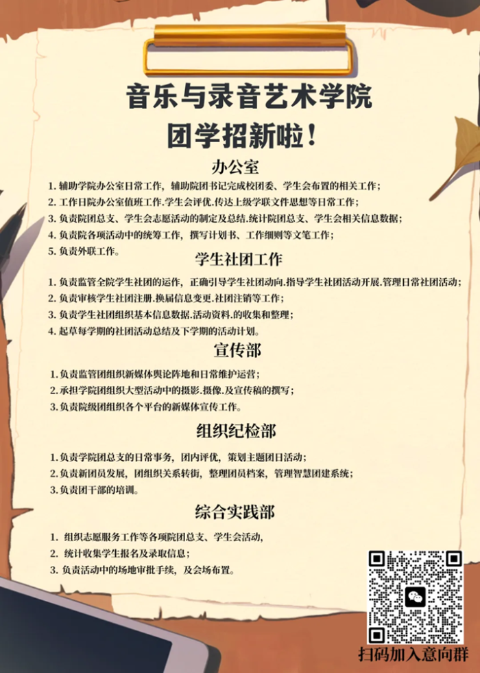 如果你也想加入我们音乐与录音艺术学院团委·学生会就请扫描下方二维码进群吧!